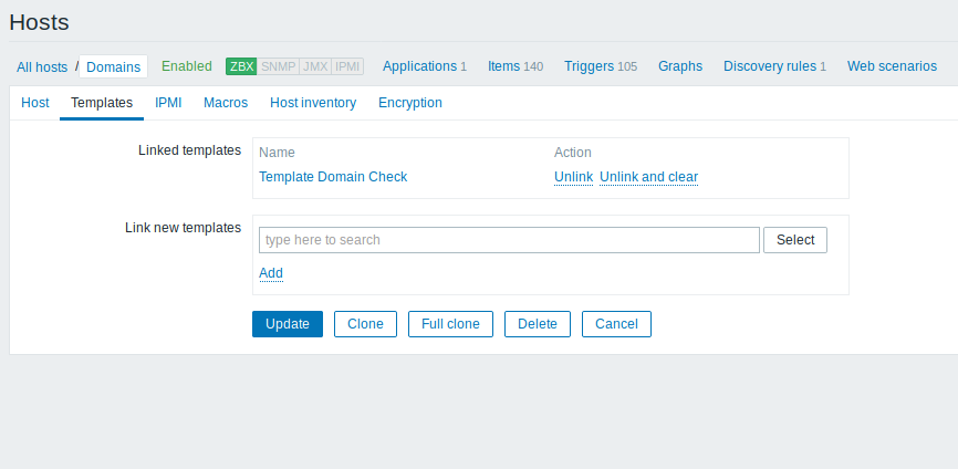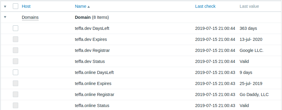- To add new domain, just edit the /etc/zabbix/domain.list. The cronjob and the discovery rule will do the rest.
